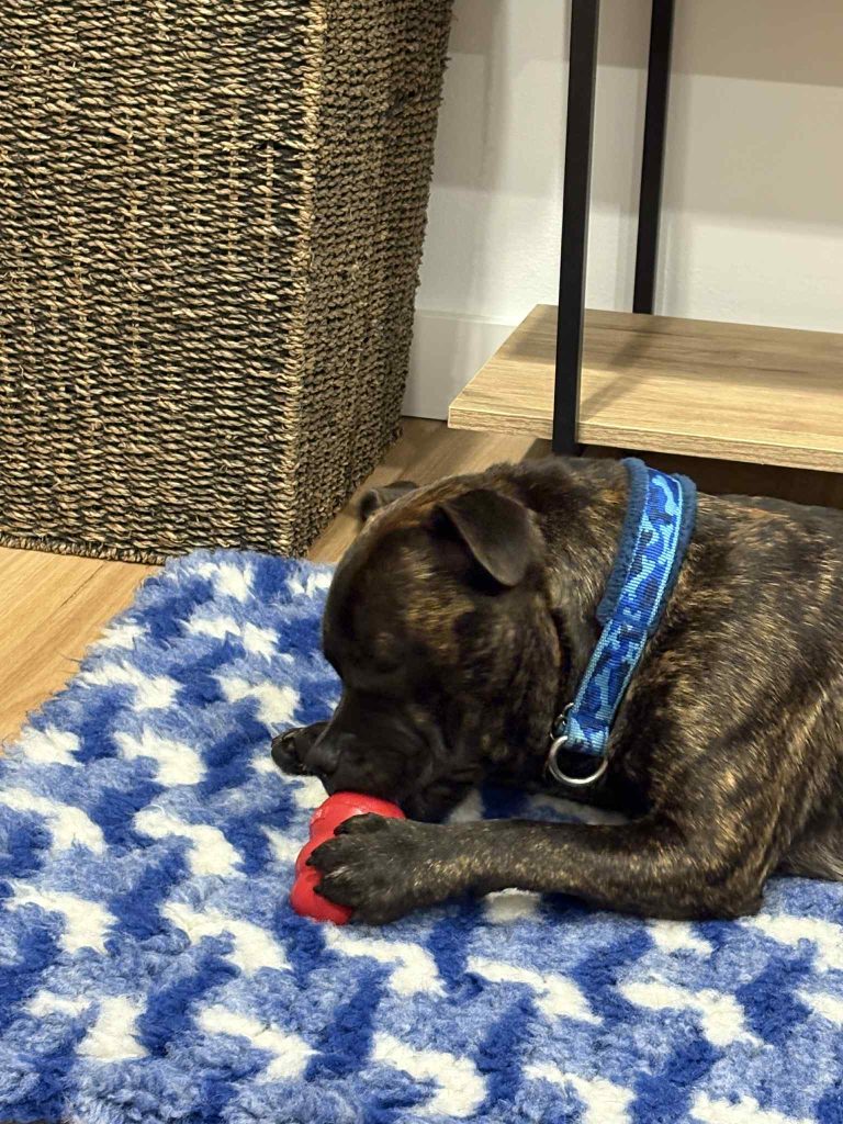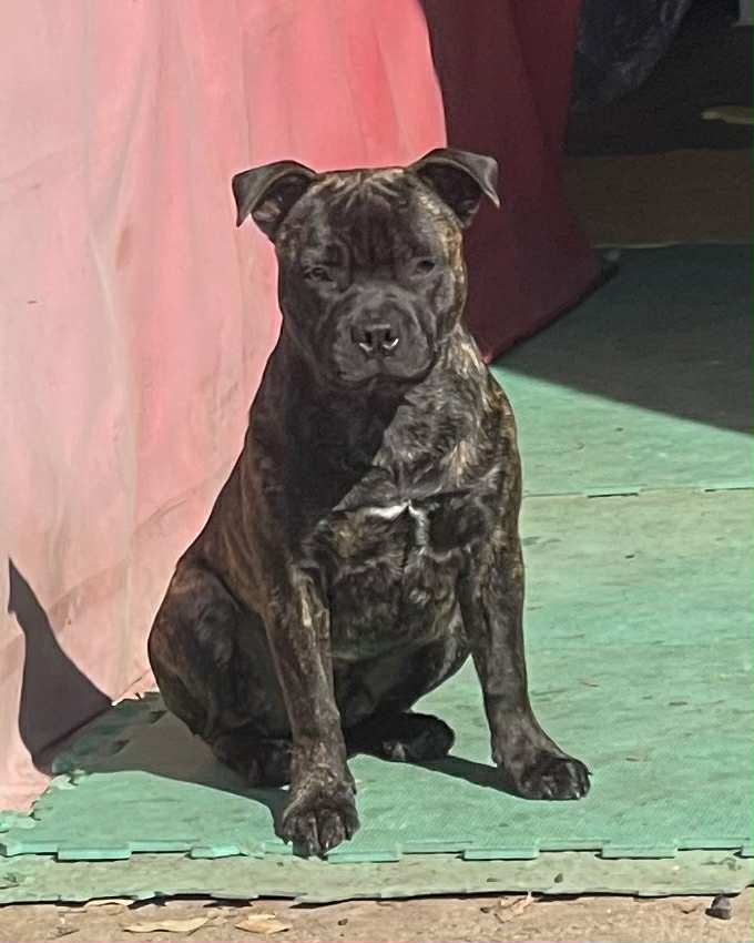 Nudge as he started out as, now Oscar, is a beautiful brindle with a mouth to die for but unfortunately has a fault that prevents him from showing or being bred from. Does that change the wonderful personality of this dog, he captured everyone with his outgoing give life your all attitude and is very happy in his home in Sydney with Michela & Ambroise